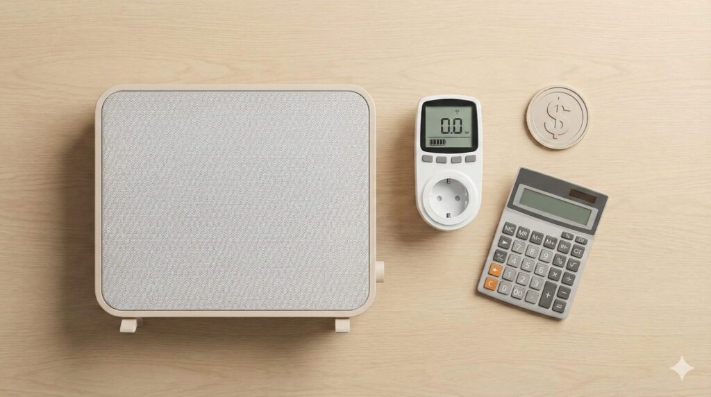 木目調のテーブルの上に置かれたパネルヒーター、電力計、電卓、コインの真俯瞰ショット。暖房器具の電気代や経済的な選び方をイメージした写真。